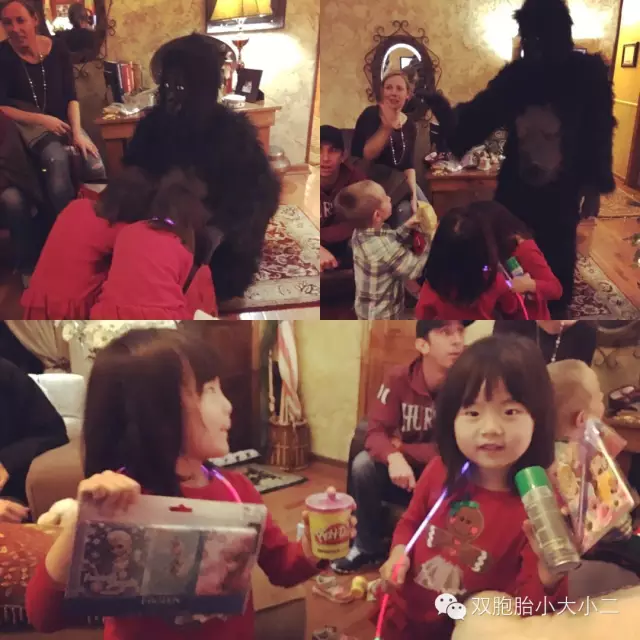 最后一个项目就是交换圣诞礼物,大人交换完礼物以后,男主人专门偷偷装扮成了一只圣诞大猩猩来给小朋友们发礼物。听主人说,他们为了让女儿不怀疑圣诞老人的真实性,专门买了一套圣诞老人的装束,男主人扮成圣诞老人,送礼物的时候故意造出一些声响,然后女主人把女儿引到楼梯间偷偷观瞧,自那起直到她14岁的时候,小姑娘都坚信圣诞老人的存在。对圣诞老人的好奇心和对圣诞礼物的憧憬是孩童时代最宝贵的回忆,我和媳妇商量我们也要尽可能久地让小大小二保持对圣诞老人的信任,我们或许也会接见这种装成圣诞老人故意被偷窥的方式。