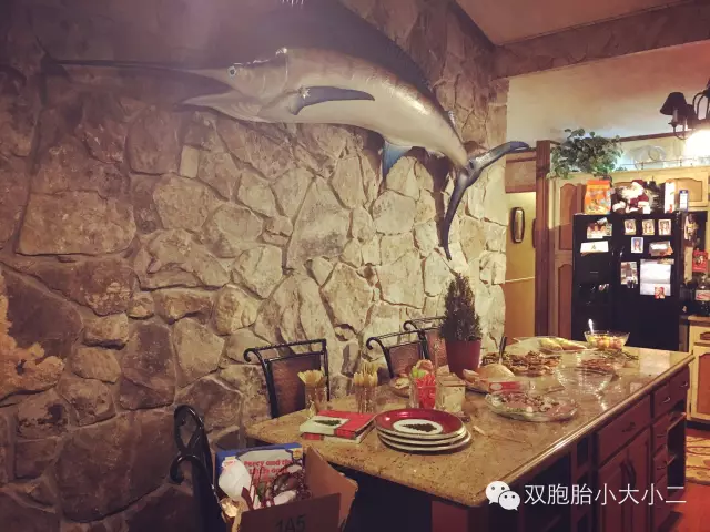 今天我们先看看美国普通家庭的圣诞聚会是什么样子。朋友的家坐落在距市中心40分钟车距的乡村,温馨的乡村小木屋后面有一大片草场。一进门,一条大鱼的装饰映入眼帘,那是一条蓝鳍金枪鱼,是主人全家在夏威夷度假时,在海上花了四个小时才拖上岸的。据说由于鱼力气太大,他们不得不用来福枪给了几枪,随后再用锤子砸碎了金枪鱼的头骨才把它拖上了船。当然这条金枪鱼的标本也是经过了遗容美化和防腐处理才置于厅堂之上的。