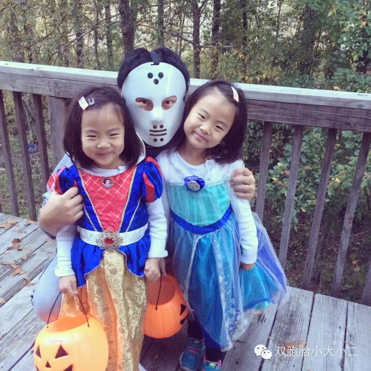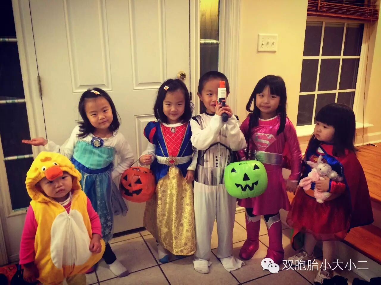 盼了好几周的万圣夜终于来到了,天还没黑,小朋友们就按耐不住驿动的心,穿上装扮就出门了。本来我们打算今年扮小天使(就是前天芭蕾舞公开课视频里穿的那身),但是小大小二突然临阵变卦了,看到衣橱里去年和前年万圣节穿过的衣服挑了半天,最后琪琪选择继续当冰雪奇缘的爱莎,妙妙则选择了白雪公主。