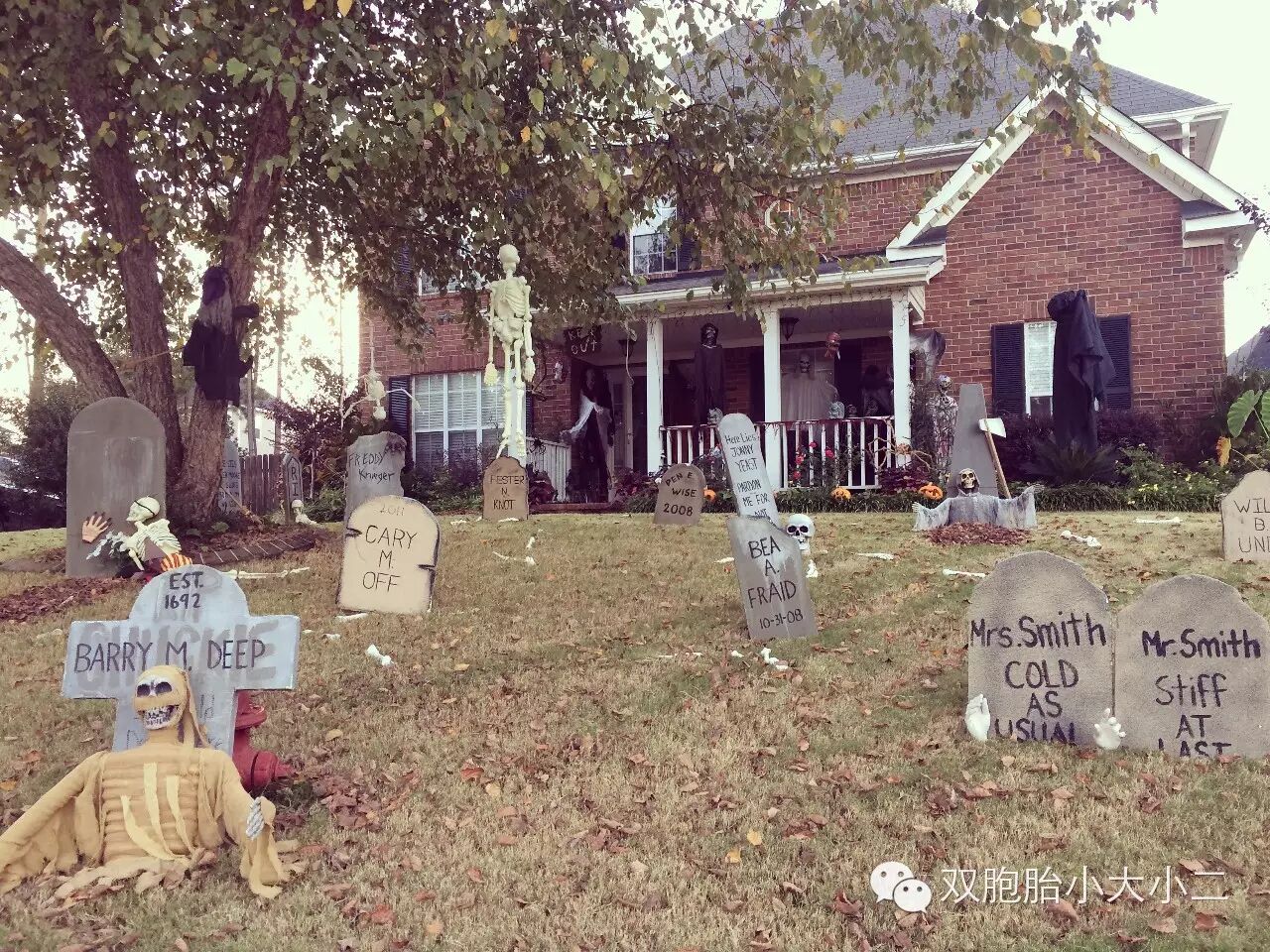 今晚我们还遇到了一家奇葩家庭,看过我们千年万圣节视频的朋友应该会有印象,他们家就是做万圣节装扮生意的,因此材料很全,他们直接把自家的房子装扮成了一个鬼屋,前院装扮成了一块坟地,然后全家老幼发动亲戚朋友齐上阵装鬼。走进他家,就会遭遇从不同方向(草坪腐烂的树叶堆下面、灌木丛后、庭院走廊边上)窜出来吓唬人的鬼,前院的坟地里还有一只拿着大刀晃来晃去的鬼游荡。另外,还有一个跟张柏芝有关系的小朋友,想知道是怎么回事,看看我们的视频吧:)